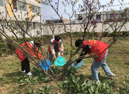 志愿者们带上劳动工具,准时来到操场集合。他们兴致高昂的穿上志愿者队服,拿起自带的工具运水到树下,大家分工明确,两三人为一个小组,有的捡拾垃圾,有的清理杂草,有的浇水,忙得不亦乐乎,在干燥的春天给花草树木送去甘霖。在志愿者们的共同努力下,树木焕发了生机,更加展现出了春意。