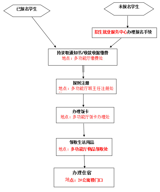 2、已报名学生携带录取通知书及预交500元住宿费票据;已通过银行转账缴费学生携带银行转账单在财务兑换正式发票。