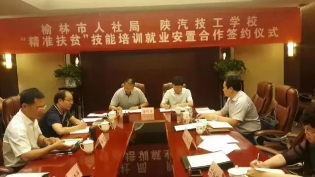 8月9日,陕西汽车技工学校与榆林市人社局精准扶贫技能培训就业安置项目合作协议签约仪式在榆林市石油宾馆举行。陕西省人力资源和社会保障厅党组成员、副厅长李军,就业促进处副处长张惠龙,榆林市人社局副局长刘岳山,副调研员刘绥梅、吴延兵,陕西汽车技工学校书记、校长李亚平等二十多人参加了签约仪式,会议由榆林市人社局局长张小明主持。