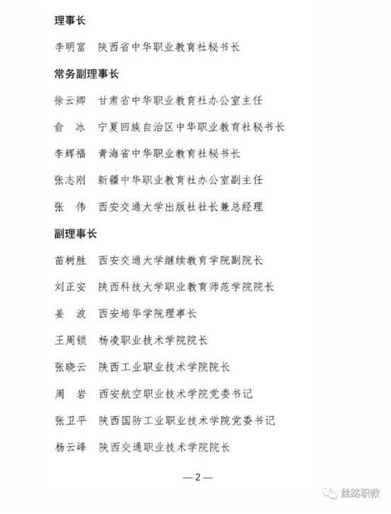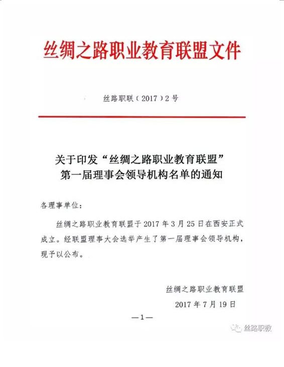 近日,“丝绸之路职业教育联盟”正式公布了第一届理事会领导机构名单。“丝绸之路职业教育联盟”于2017年3月25日在西安正式成立。经“丝绸之路职业教育联盟”理事大会选举产生了第一届理事会领导机构。“丝绸之路职业教育联盟”第一届理事会设理事长一人,常务副理事5人,副理事长19人,秘书长一人,常务副秘书长一人。理事长由陕西省中华职业教育社秘书长李明富担任。陕西汽车技工学校书记、校长李亚平任副理事长。