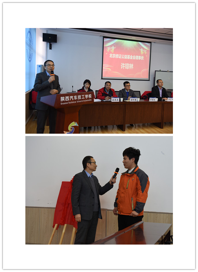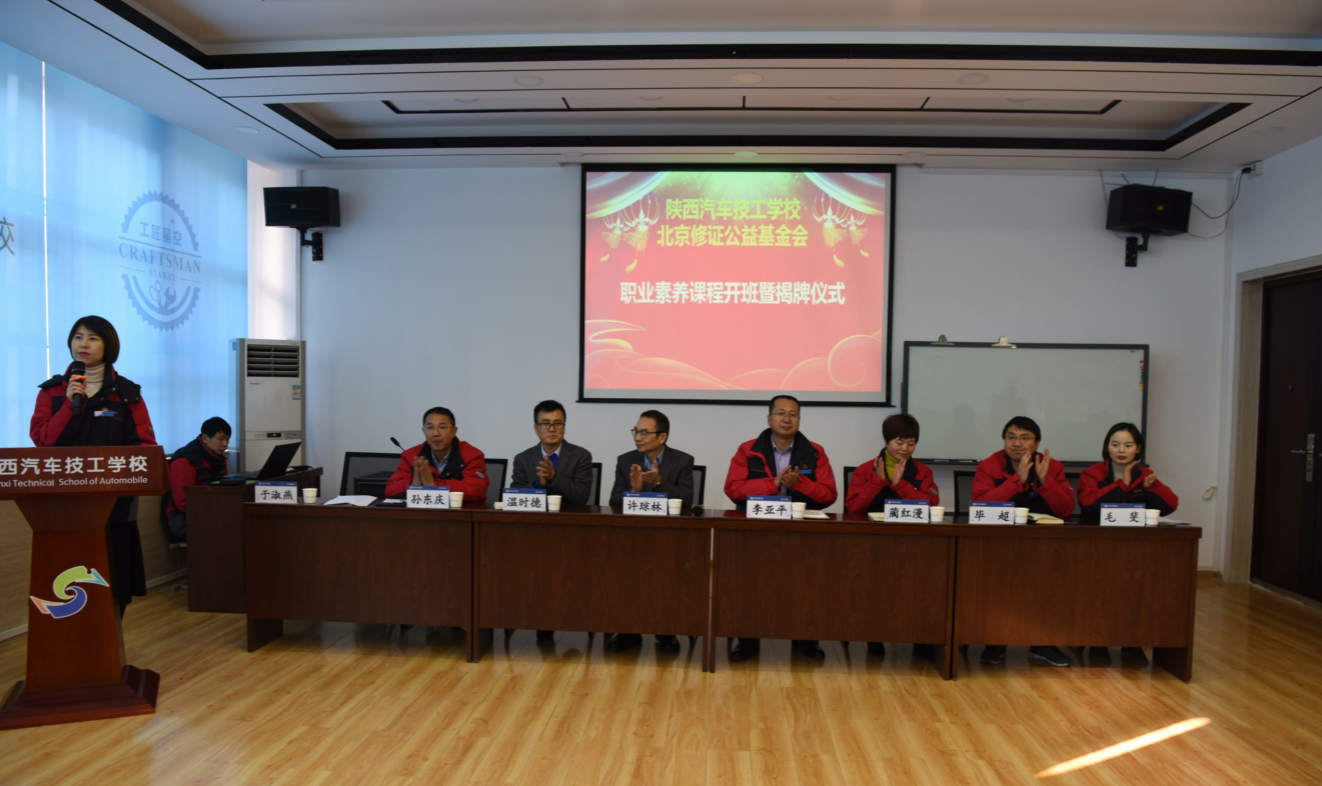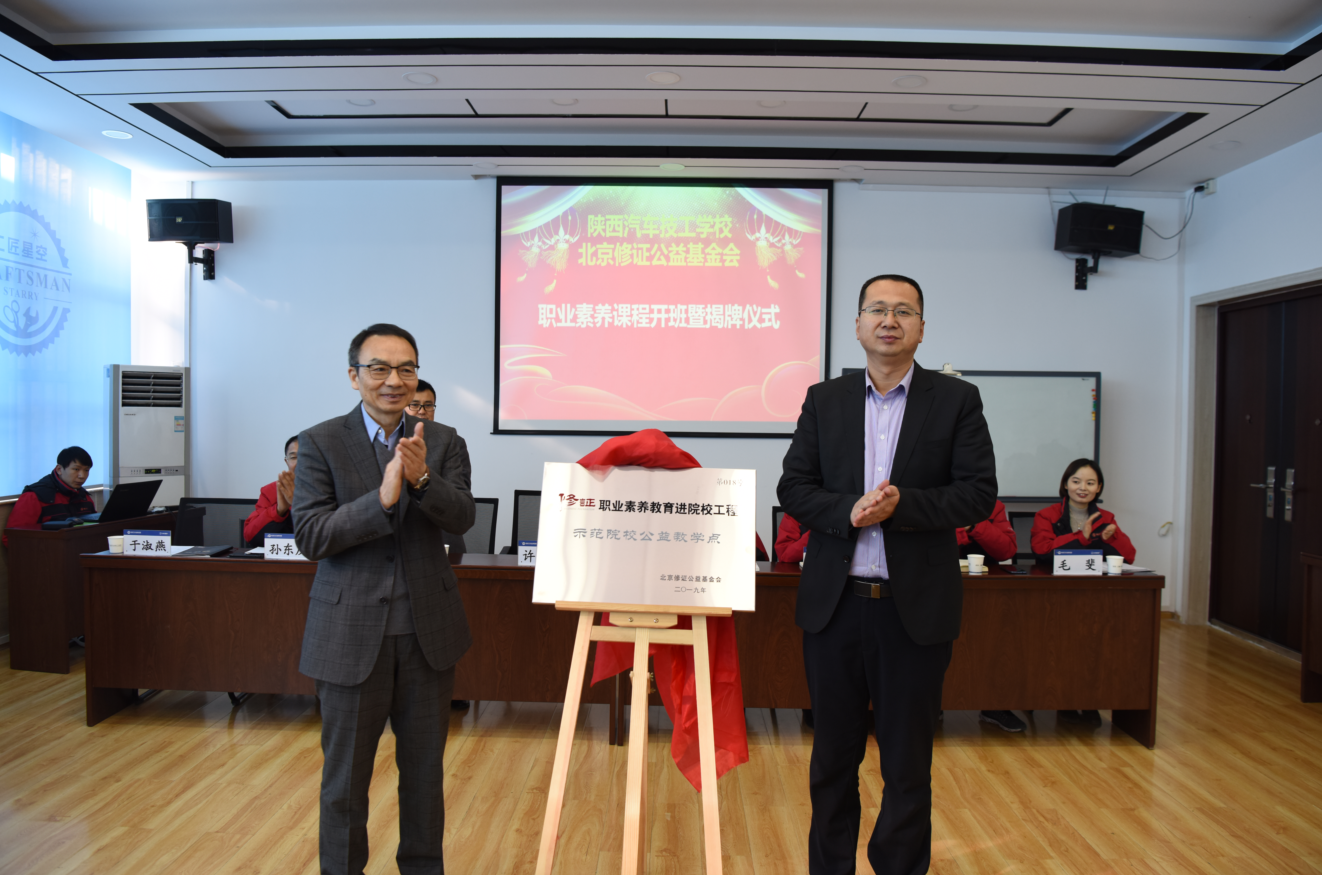 2019年12月2日上午,陕西汽车技工学校与北京修证公益基金会职业素养课程开班暨揭牌仪式在我校103教室举行,北京修证公益基金会理事长许琼林和陕西汽车技工学校书记、校长李亚平共同为公益教学点揭牌,并且为首批教学班30名学生赠送《职业素养》教材,北京职场成功教育咨询发展有限公司总经理温时德,陕西汽车技工学校相关负责人、教师、试点班全体学员参加了揭牌仪式。