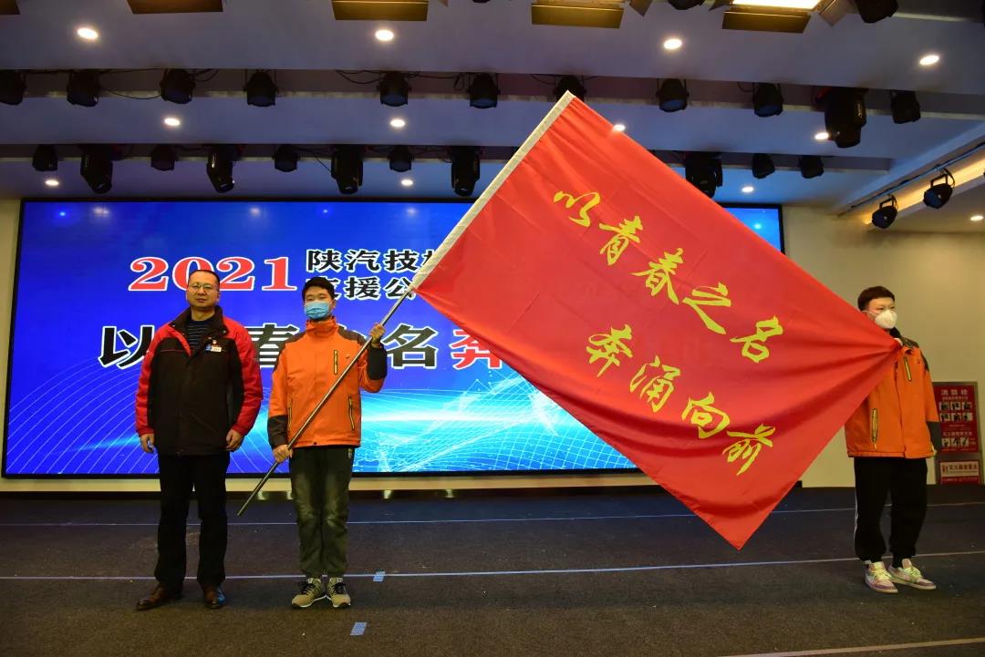 陕汽技校党支部书记、校长李亚平为本次入企实践学生代表授“以青春之名,奔涌向前”队旗。