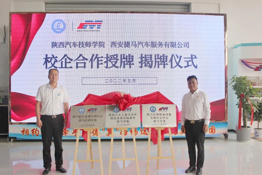 随后校企双方举行了隆重的揭牌仪式,我校党支部书记、校长李亚平和捷马公司董事长马林共同为“校企合作产教融合培训基地”、 “企业培训中心捷马分部”、“等级认定中心捷马分中心”和“陕西汽车工业青少年科技素质实践教育捷马基地”揭牌。